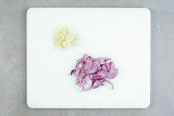 In einem großen Topf ausreichend gesalzenes Wasser für die Pasta zum Kochen bringen. Die Zwiebeln und den Knoblauch schälen, halbieren und in dünne Scheiben schneiden.
