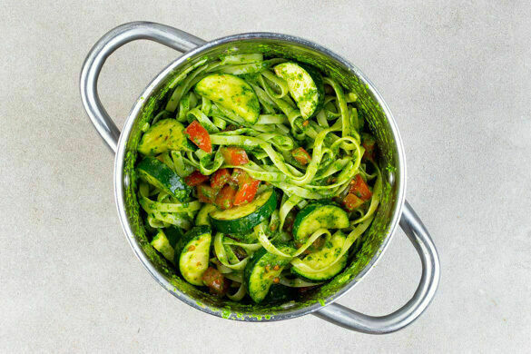 Fleischliebhaber aufgepasst: Das zarte Hähnchenfleisch wird mit Speck ummantelt im Ofen gegart – da läuft einem das Wasser schon beim Kochen im Munde zusammen. Dazu gibt es feine Pasta mit einem würzigen Spinat-Petersilien-Pesto, natürlich mit Käse, das mit frischen Tomatenwürfeln und gebackener Zucchini das Pastaglück vervollständigt. Lasst es euch schmecken!