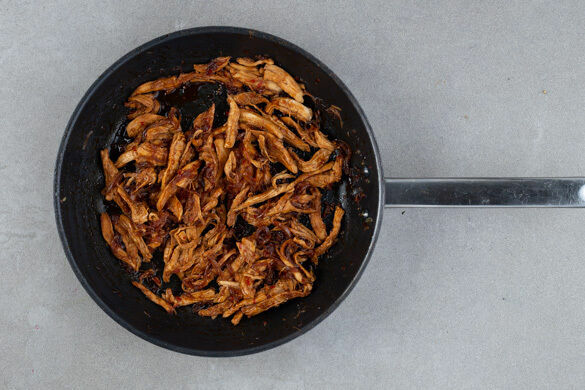 Das Fleisch mit zwei Gabeln in feine Streifen zerzupfen und 2–3Min. in der Sauce erwärmen. Mit Salz und Pfeffer abschmecken.