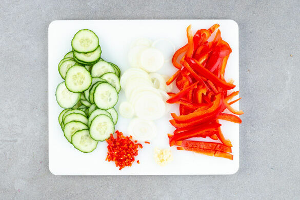 Die Gurke in dünne Scheiben schneiden. Die Zwiebel schälen und in feine Ringe schneiden. Die Paprika vierteln, entkernen und in dünne Streifen schneiden. Den Knoblauch schälen und fein würfeln. Die Peperoni längs halbieren und ca. ⅓ oder mehr in feine Würfel schneiden. Tipp: Für weniger Schärfe die Kerne entfernen.