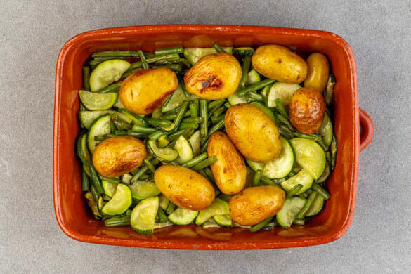 Die Enden der grünen Bohnen entfernen. Die Kartoffeln, die Zucchini und die Bohnen in eine Auflaufform geben, mit 2EL Olivenöl, ½TL Salz und 1 kräftigen Prise Pfeffer vermengen und 20–25Min. im Ofen backen.