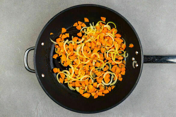Die Karotten ggf. schälen, längs vierteln und quer in dünne Scheiben schneiden. Die Zwiebeln schälen, halbieren und in feine Streifen schneiden. Das Gemüse in einer großen Pfanne mit 1EL Butter bei mittlerer Hitze in 5–7Min. goldbraun anbraten.