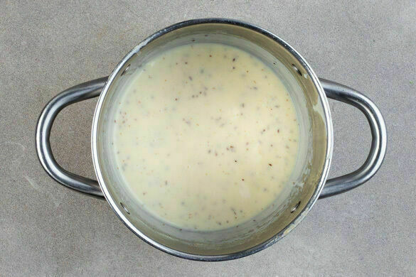 50g Butter in einem kleinen Topf bei mittlerer bis niedriger Hitze zum Schmelzen bringen, dann 2EL Mehl einrühren. Die Mehlschwitze 1–2Min. erwärmen.