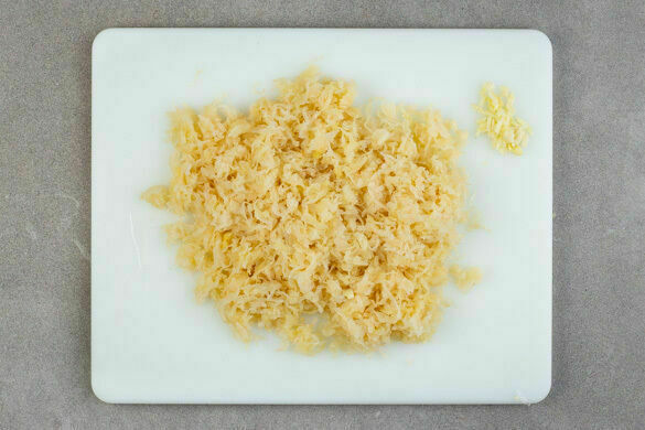 1,5L Wasser in einem Wasserkocher aufkochen. Inzwischen den Knoblauch schälen und fein würfeln oder durch eine Knoblauchpresse drücken. Das Sauerkraut in einem Sieb mit dem kochenden Wasser übergießen und anschließend mit einem Messer oder einer Schere grob zerkleinern.