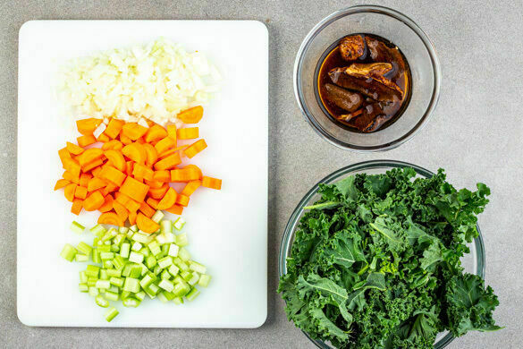 Den Knoblauch schälen und grob würfeln. Die Zwiebeln, die Karotten, den Sellerie, die Grünkohlstiele und die ½ des Knoblauchs in einem großen Topf mit 4EL Olivenöl und 2TL Salz bei mittlerer Hitze 5–7Min. garen, bis das Gemüse beginnt, weich zu werden.