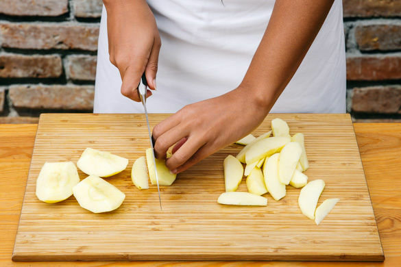 Die Äpfel schälen, vierteln, entkernen und in dünne Spalten schneiden. In einem mittelgroßen Topf 200ml Wasser zum Kochen bringen. Den Hartkäse fein reiben.