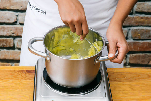 Die Apfelspalten und den Zimt nach Geschmack in den Topf geben und abgedeckt bei mittlerer Hitze ca. 4Min. köcheln lassen, bis die Äpfel weich sind und leicht zerfallen. Die Äpfel mit einer Gabel zu einem Kompott zerdrücken und nach Geschmack mit etwas Zucker verfeinern. Bis zum Servieren beiseitestellen.