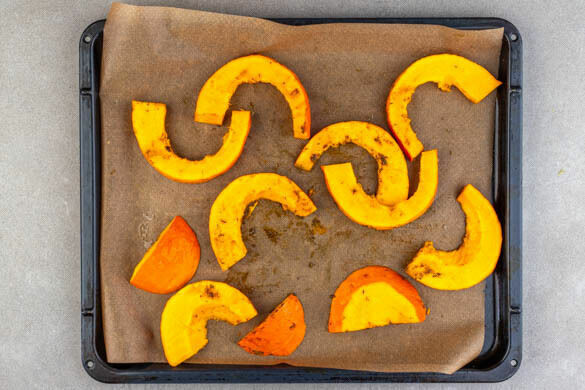 Den Backofen auf 230°C (210°C Umluft) vorheizen. Den Kürbis halbieren, entkernen und in 1–2cm dicke Scheiben schneiden. Mit 2EL Olivenöl, der ½ der Gewürzmischung und 2 Prisen Salz vermengen und auf zwei mit Backpapier ausgelegten Backblechen verteilen.