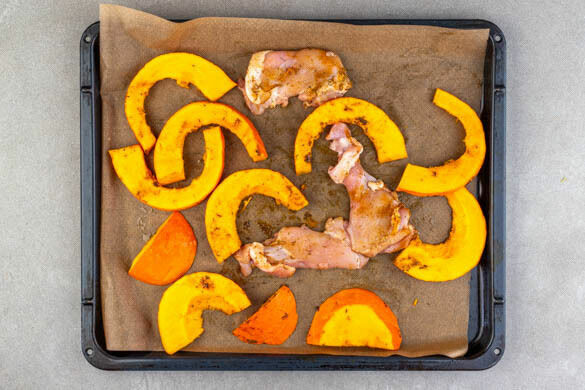 Das Fleisch zum Kürbis auf die Backbleche geben. Den Kürbis und das Fleisch 18–22Min. im Ofen backen, bis der Kürbis weich und das Fleisch leicht knusprig und durchgegart ist. Die Garzeit kann je nach Dicke des Fleisches variieren. Die Position der Bleche nach der Hälfte der Zeit tauschen.