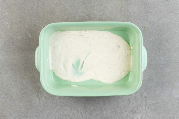 In einer großen Auflaufform die Crème fraîche mit der Gewürzmischung, 1TL Salz und ½TL Pfeffer verrühren. Die Pasta in das kochende Wasser geben und ca. 2Min. vorkochen, dann in ein Sieb abgießen und abtropfen lassen.