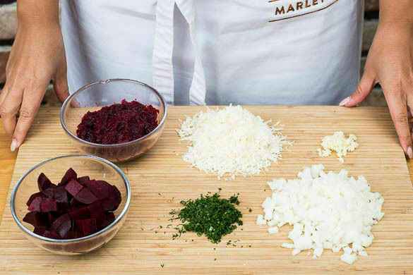 Die Roten Beten abtropfen lassen. Die ½ der Roten Beten in 1–2cm große Stücke schneiden, die übrigen Beten fein reiben. Die Zwiebel schälen, halbieren und in feine Würfel schneiden. Den Knoblauch schälen und ebenfalls fein würfeln. Den Dill samt Stängeln fein schneiden. Den Käse fein reiben.
