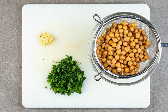 Die Kichererbsen in einem Sieb mit kaltem Wasser abspülen und abtropfen lassen. Die Petersilie samt Stängeln grob schneiden. Die übrige Knoblauchzehe schälen und fein würfeln. In einem großen Topf 800ml Wasser zum Kochen bringen.
