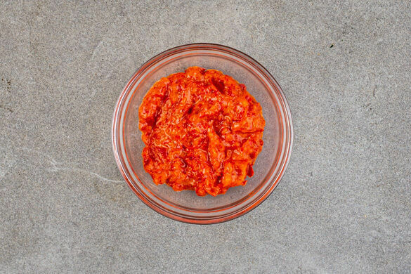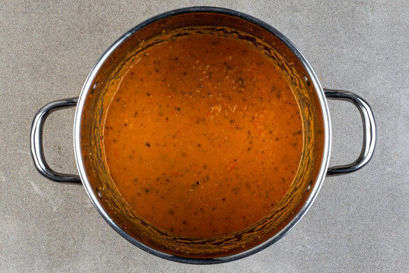Das Gemüse aus dem Ofen nehmen. Die geröstete Paprika in ein hohes Gefäß geben und mit einem Stabmixer grob pürieren. Den Stabmixer noch nicht abspülen. 2EL Butter in kleine Würfel schneiden, unter die pürierte Paprika mengen und schmelzen lassen.