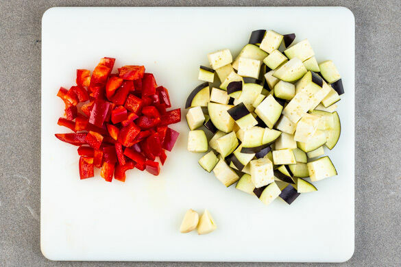 Den Backofen mit Grillfunktion oder Ober-/Unterhitze auf 220°C vorheizen. Die Paprika vierteln, entkernen und in ca. 2cm große Würfel schneiden. Die Aubergine ebenfalls in ca. 2cm große Würfel schneiden. Die Zwiebel schälen und grob würfeln. Eine Knoblauchzehe schälen und halbieren.