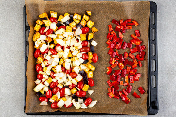 Die Paprika auf eine Seite eines mit Backpapier ausgelegten Backbleches geben, mit 1EL Olivenöl und 1 Prise Salz vermengen. Die Kirschtomaten, die Auberginen, die Zwiebeln und den Knoblauch auf der anderen Seite mit der Gewürzmischung, 1 Prise Salz und 1EL Olivenöl vermengen. Das Gemüse ca. 10Min. im Ofen rösten, bis es leicht gebräunt ist.