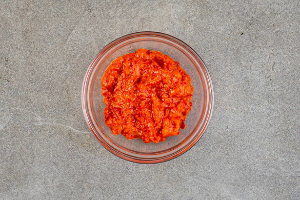 Das Gemüse aus dem Ofen nehmen. Die geröstete Paprika in ein hohes Gefäß geben und mit einem Stabmixer grob pürieren. Den Stabmixer noch nicht abspülen. 1EL Butter in kleine Würfel schneiden, unter die pürierte Paprika mengen und schmelzen lassen.