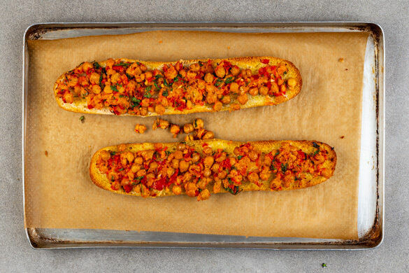 Die Kichererbsen, die ½ der Petersilie, den gewürfelten Knoblauch, ½TL Salz und 1 Prise Pfeffer mit der Paprikabutter vermengen und mit einer Gabel grob zerdrücken. Das Brötchen aufschneiden und mit dem Paprika-Kichererbsen-Mix bestreichen. Die Crostini 7–8Min. im Ofen backen. Die Suppe mit der übrigen Petersilie garnieren und mit den Crostini servieren.