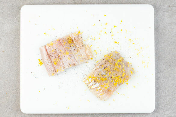 Den Fisch mit kaltem Wasser abspülen, trocken tupfen und evtl. vorhandene Gräten mit einer Pinzette entfernen. Den Fisch rundum mit ca. 1TL Zitronenschale und Pfeffer nach Geschmack würzen.