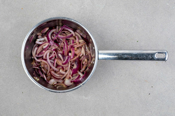 Die Zwiebeln schälen, halbieren und in dünne Streifen schneiden, dann in einem mittelgroßen Topf mit 1EL Olivenöl bei mittlerer Hitze 2–3Min. anbraten. Inzwischen den Apfel schälen und vierteln, dabei das Kerngehäuse entfernen. Die Apfelviertel in 1–2cm große Stücke schneiden.
