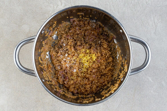 Die Zwiebelwürfel in einem mittelgroßen Topf mit 2EL Butter bei mittlerer Hitze in 2–4Min. glasig anschwitzen. Den Reis unterrühren, dann mit der Brühe ablöschen und einmal aufkochen lassen. Abgedeckt ca. 20Min. im Ofen garen.