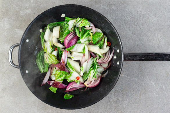 Kurz bevor das Fleisch und der Reis fertig sind, den Pak Choi und die Zwiebelspalten in einer großen Pfanne mit 1EL Olivenöl bei starker Hitze 3–4Min. scharf anbraten. Den Knoblauch zugeben, mit 50ml Wasser ablöschen und 1–2Min. köcheln lassen. Mit dem restlichen 5-Gewürze-Pulver, den Chiliringen, dem Zitronensaft und Salz abschmecken.