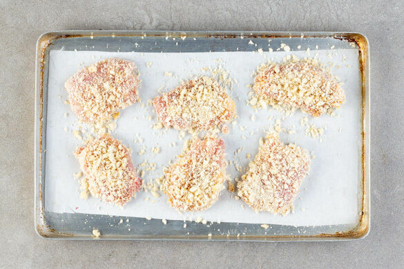 Das Fleisch trocken tupfen und halbieren. Mit 1EL Olivenöl, 1TL 5-Gewürze-Pulver und 1 Prise Salz einreiben und anschließend in der ½ des Panko-Paniermehls wälzen. Wer mag, kann auch mehr Paniermehl verwenden. Auf ein mit Backpapier ausgelegtes Backblech geben, mit insgesamt 1EL Olivenöl beträufeln und ca. 20Min. im Ofen knusprig backen.
