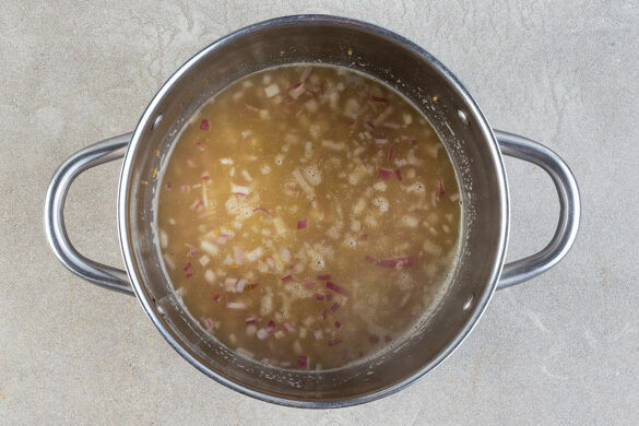 Die Zwiebelwürfel in einem kleinen Topf mit 1EL Butter bei mittlerer Hitze in 2–4Min. glasig anschwitzen. Den Reis unterrühren, dann mit der Brühe ablöschen und einmal aufkochen lassen. Abgedeckt ca. 20Min. im Ofen garen.