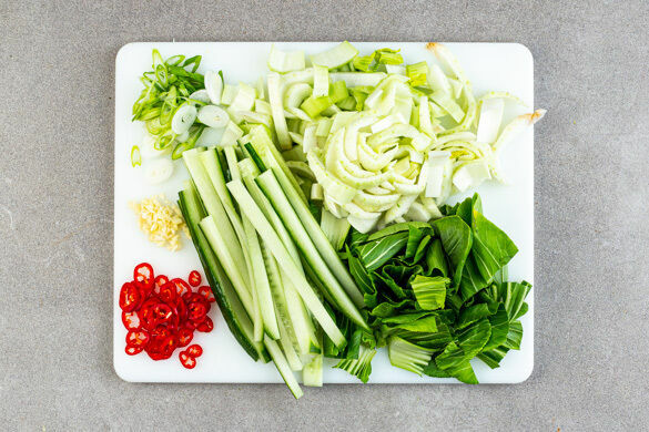 Die Peperoni in dünne Ringe schneiden, ggf. für weniger Schärfe die Kerne entfernen. Den Knoblauch schälen und fein würfeln. Den weißen Teil des Pak Choi in ca. 1cm breite, die grünen Blätter in 2–3cm breite Streifen schneiden. Die Gurke quer halbieren, dann erst in dünne Scheiben und anschließend in dünne Stifte schneiden. Die Lauchzwiebel schräg in feine Ringe schneiden.