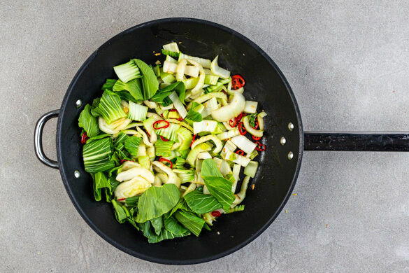 In einer mittelgroßen Pfanne oder einem Wok 1EL Pflanzenöl und das Sesamöl bei mittlerer Hitze erwärmen. Die Peperoni und den Knoblauch ca. 1Min. im heißen Öl anbraten, dann die weißen Pak-Choi-Streifen hinzugeben und 1–2Min. unter Rühren braten. Dann den übrigen Pak Choi zugeben und ca. 2Min. braten. Mit 1 Prise Salz und Pfeffer würzen.