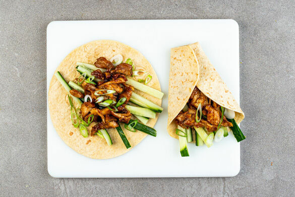 Heute gibt’s wieder mal eine echte Crossover-Leckerei, bei deren bloßem Anblick uns schon das Wasser im Munde zusammenläuft: Gebackenes Hähnchenschenkelfleisch, frische Gurke und Lauchzwiebeln, feurige Peperoni, exotische Hoisinsauce und eleganter Pak Choi erinnern an das ferne Asien – serviert wird das Ganze allerdings als Wrap in mexikanischen Tortillas. Schön, dass die Welt kulinarisch immer näher zusammenrückt!