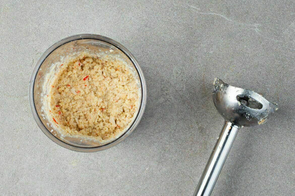 Den Ingwer samt Schale grob würfeln. Das untere Drittel des Zitronengrases fein würfeln. Die Chilischote längs halbieren und fein würfeln. Tipp: Für weniger Schärfe die Kerne entfernen. Den Ingwer, das gewürfelte Zitronengras, ⅔ der Kokosraspel und Chili nach Geschmack mit 5–6EL Wasser in einem hohen Gefäß mit einem Stabmixer zu einer groben Paste pürieren.
