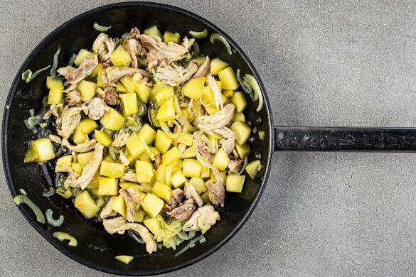 Das Fleisch trocken tupfen, mit ½TL Salz in das kochende Wasser geben und abgedeckt bei mittlerer Hitze in 8–10Min. gar köcheln. Das Fleisch aus dem Topf nehmen, abkühlen lassen und mit 2 Gabeln in kleine Stücke zupfen. Das Kochwasser aufbewahren.