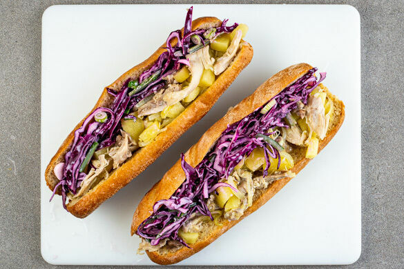 Perfektion ist schwer zu erreichen – aber wir haben es geschafft! In deinem knusprigen Baguette verschmilzt saftiges, gezupftes Hähnchenfleisch mit geschmorter Apfel-Zwiebel-Sauce. Für den Extrakick sorgen hauchdünne Rotkohlstreifen und pikante Jalapeño-Chili in cremig-würzigem Dressing. Serviert mit rauchigen gebackenen Süßkartoffeln gibt es diesem Sandwich wirklich nichts mehr hinzuzufügen, außer: Guten Appetit!