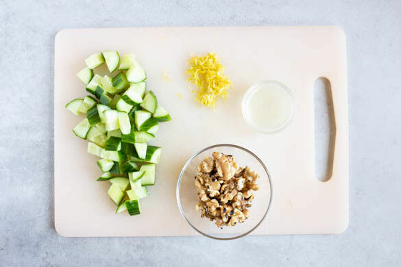 Die Walnüsse grob hacken und in einer kleinen Pfanne ohne Zugabe von Fett bei mittlerer Hitze 1–2Min. anrösten. Vorsicht, sie können schnell zu dunkel werden. Zum Abkühlen aus der Pfanne nehmen und beiseitestellen. Die Zitronenschale abreiben, dann die Zitrone halbieren und auspressen. Die Gurke längs vierteln und in ca. 1cm große Stücke schneiden.