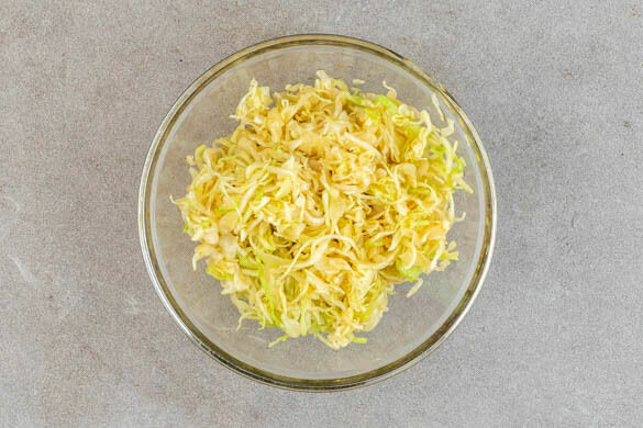 Den Backofen auf 220°C (200°C Umluft) vorheizen. Die ½ der Sojasauce und 1EL Essig mit je 1 Prise Zucker und Salz verrühren. Den Weißkohl 1–2Min. gründlich mit dem Dressing verkneten.