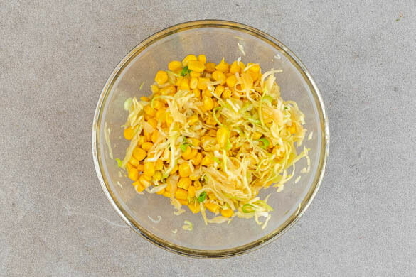 Einen mittelgroßen Topf ca. 1cm hoch mit Wasser befüllen und das Wasser zum Kochen bringen. Die Lauchzwiebel längs halbieren und quer in feine Streifen schneiden. Den Mais in ein Sieb abgießen und abtropfen lassen.