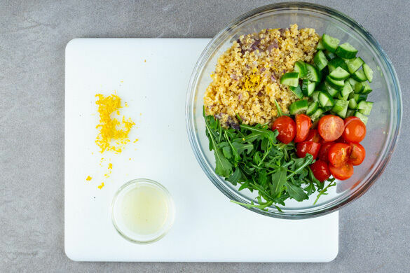 Die Zitronenschale abreiben, dann die Zitrone halbieren und auspressen. Die Gurke längs vierteln, in kleine Stücke schneiden und mit den gebackenen Tomaten und dem Rucola unter den Bulgur mischen. Nach Geschmack mit dem Zitronensaft und -abrieb sowie Salz und Pfeffer würzen. Das Fleisch schräg in Tranchen schneiden, auf dem Bulgur anrichten und servieren.
