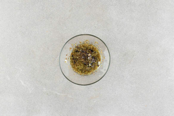 Den Backofen auf 200°C (180°C Umluft) vorheizen. Den Knoblauch schälen und mit der ½ der Oliven grob würfeln, dann mit der ½ des Oregano, 2EL Olivenöl, 1EL Essig, 1TL Senf, ½TL Salz und 1 Prise Pfeffer verrühren. Tipp: Wer es etwas süßer mag, gibt noch ½TL Honig oder Zucker dazu.