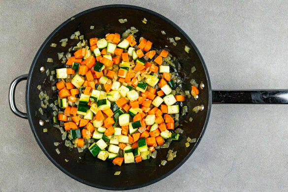 Die Karotten ggf. schälen, längs vierteln und in grobe Würfel schneiden. Die übrigen Zucchini ebenfalls längs vierteln und grob würfeln. Die Zwiebel schälen, halbieren und fein würfeln. Den Knoblauch schälen und grob würfeln. Die Zwiebeln, den Knoblauch und das Gemüse in einer großen Pfanne mit 2EL Olivenöl bei mittlerer bis starker Hitze in 8–10Min. weich braten.