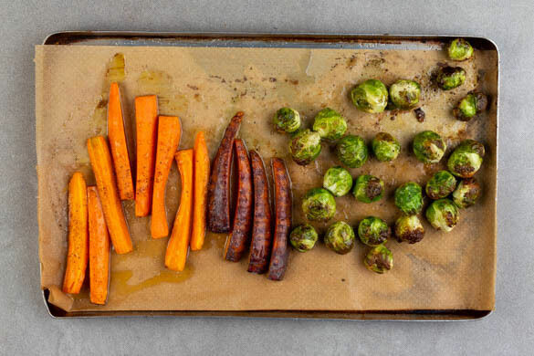 Die Karotten ggf. schälen, quer halbieren und längs vierteln. Den Rosenkohl ggf. verlesen und mit den Karotten auf einem mit Backpapier ausgelegten Backblech mit 2EL Olivenöl und je 1 kräftigen Prise Salz und Pfeffer vermengen. Im Ofen 18–22Min. rösten, bis das Gemüse goldbraun und gar ist.