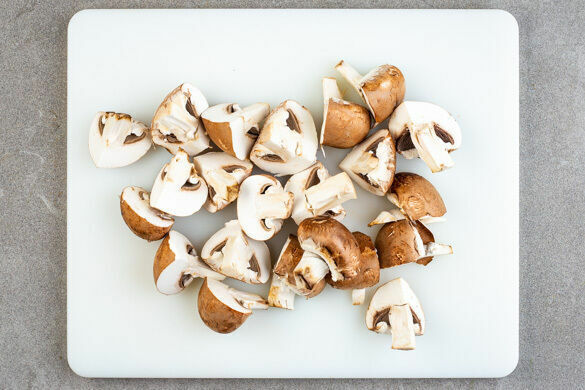 In einem großen Topf ausreichend gesalzenes Wasser für ¾ der Nudeln zum Kochen bringen. Die Pilze ggf. säubern und je nach Größe halbieren oder vierteln.