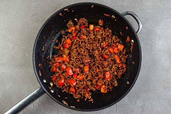 Inzwischen 2EL Pflanzenöl in der Pfanne bei mittlerer Hitze erwärmen. Das Hackfleisch zugeben und in 4–6Min. gar und leicht knusprig braten. Die ½–¾ der Chilipaste, die Misopaste und die Tomatenwürfel einrühren und 30Sek.–1Min. erhitzen, dann den Knoblauch hinzugeben und ebenfalls ca. 30Sek. mitbraten.