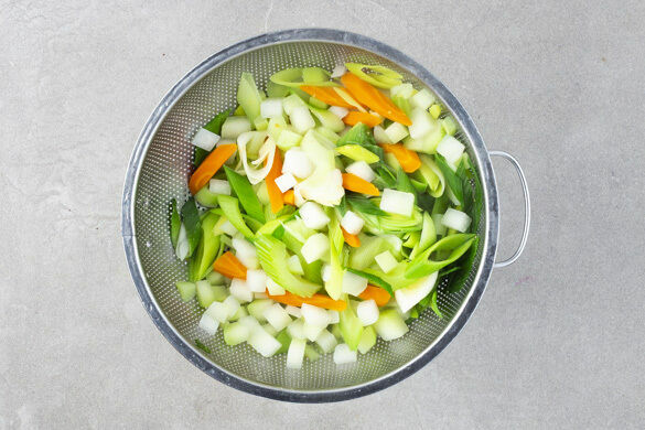 Den Kohlrabi, die Karotten und den Sellerie im kochenden Wasser in 6–8Min. bissfest garen. Den Lauch in der letzten Minute dazugeben und mitkochen. Das Gemüse in ein Sieb abgießen, kurz abtropfen lassen und wieder zurück in den Topf geben. Beiseitestellen.