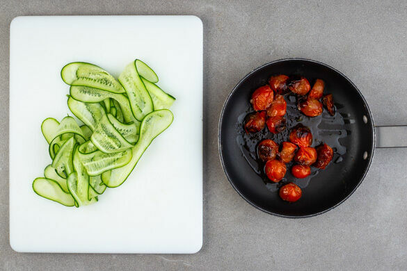 Die Kirschtomaten in einer mittelgroßen Pfanne mit 1TL Olivenöl bei starker Hitze 3–4Min. anbraten, bis sie zu bräunen beginnen und aufplatzen, dabei gelegentlich umrühren. Die Gurke mit einem Sparschäler rundherum in dünne, breite Streifen schneiden.