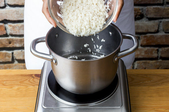 Den Reis in einem Sieb unter fließendem Wasser abspülen, bis das Wasser klar bleibt. Sobald das Wasser kocht, den Reis hineingeben und abgedeckt bei niedrigster Hitze 10–12Min. kochen, bis das Wasser aufgesogen und der Reis gar ist. Noch ca. 5Min. ohne Hitzezufuhr ziehen lassen.