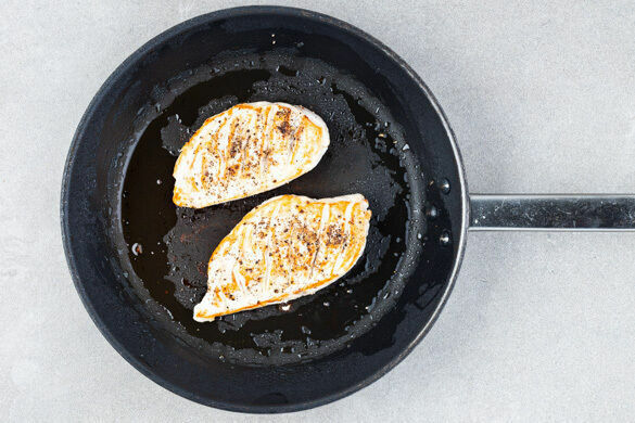 In einem Wasserkocher ca. 1,5L Wasser zum Kochen bringen. Das Fleisch trocken tupfen, jeweils horizontal zu 2 dünnen Schnitzeln halbieren und im Abstand von ca. 1cm schräg einschneiden. Mit Salz und Pfeffer würzen und in einer großen Pfanne mit 2EL Olivenöl bei starker Hitze auf jeder Seite ca. 1Min. scharf anbraten.