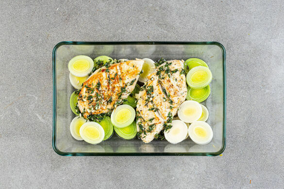 Den Lauch in 1–2cm breite Ringe schneiden. Das Fleisch und den Lauch in eine Auflaufform geben, mit dem Thymian-Zitronen-Öl beträufeln und anschließend im Ofen 12–15Min. garen, bis das Fleisch durch ist.