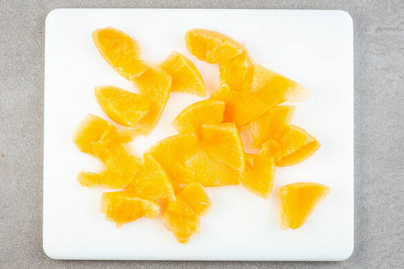 Die Melone halbieren, in Spalten schneiden und mit einem scharfen Messer die Schale entfernen. Das Fruchtfleisch in mundgerechte Stücke schneiden.
