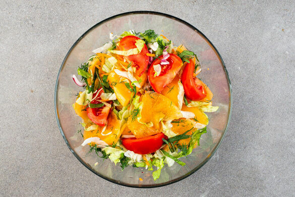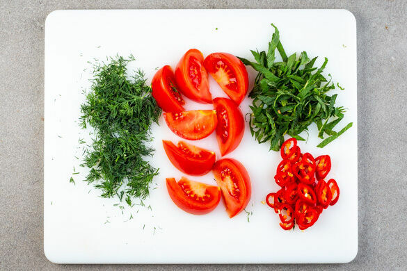 Die Tomate in Spalten schneiden, den Strunk entfernen. Den Dill samt Stängeln fein schneiden. Die Minzeblätter abzupfen und in feine Streifen schneiden. Die Peperoni in dünne Ringe oder feine Streifen schneiden. Tipp: Für weniger Schärfe die Kerne entfernen.