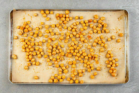 Den Backofen auf 230°C (210°C Umluft) vorheizen. Die Kichererbsen in einem Sieb mit kaltem Wasser abspülen und abtropfen lassen. Die Kichererbsen trocken tupfen und auf einem mit Backpapier ausgelegten Backblech mit 2EL Olivenöl, dem Paprikapulver und ½TL Salz vermengen. In den aufheizenden Ofen geben und in 20–25Min. goldbraun und knusprig backen.